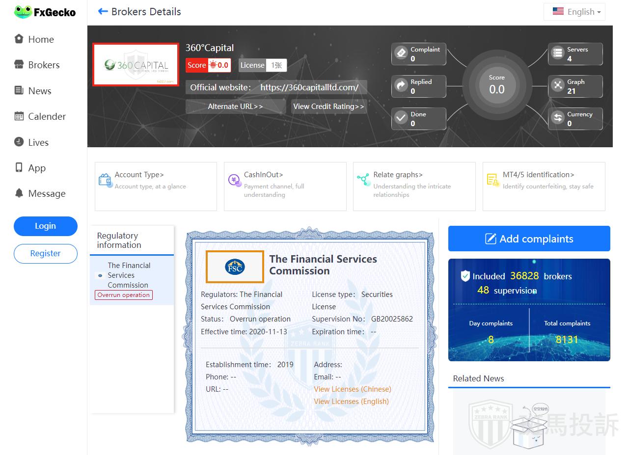 This broker is called 360°Capital, which has been established for one year and ranks 1592 in the world. At present, there are 1 foreign exchange licenses, and the risk scan shows 12 risks. Investors need to pay attention to relevant risks.