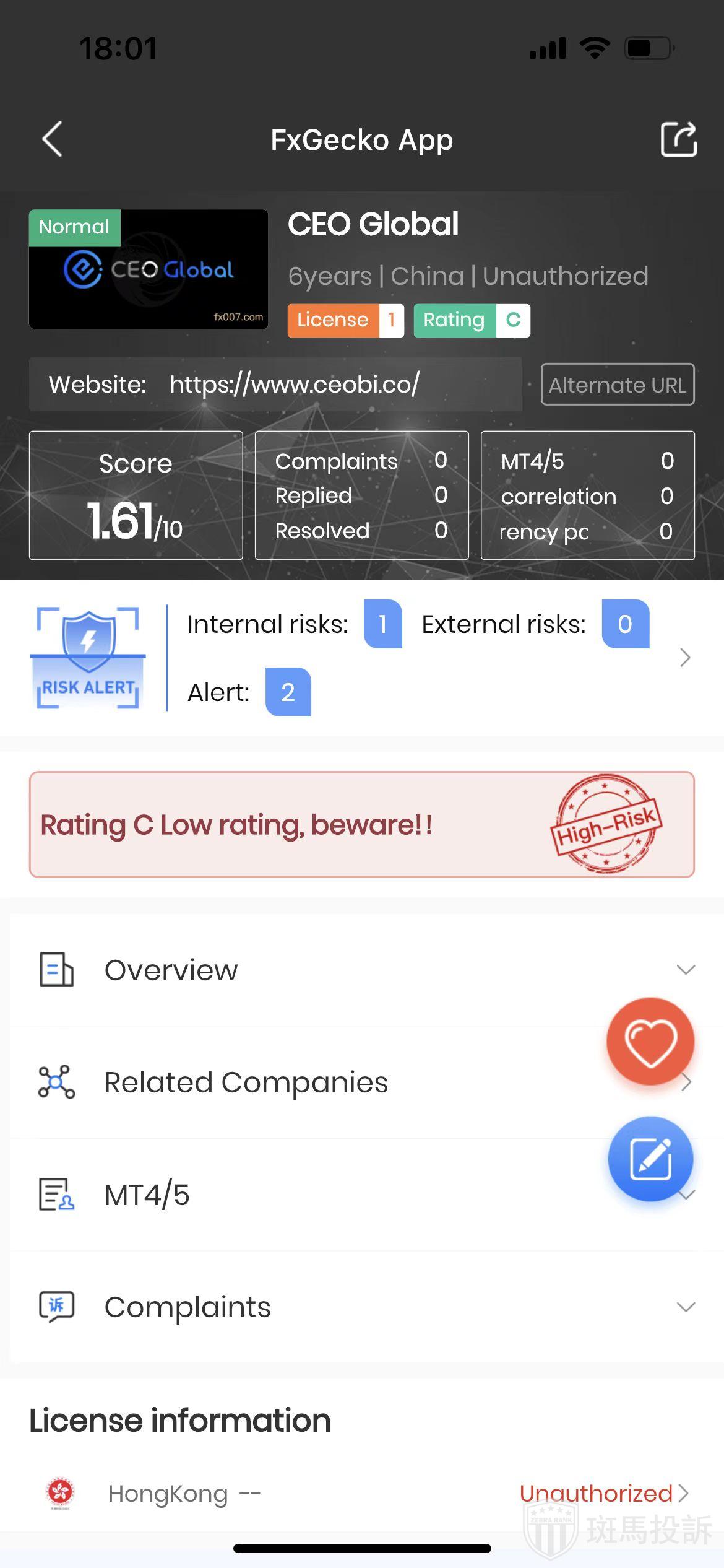This broker is called CEO Global, which has been established for one year and Historical statusranks 0 in the world. At present, there are 0 foreign exchange licenses, and the risk scan shows 3 risks. Investors need to pay attention to relevant risks.
