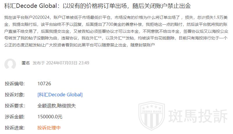 The FTI APP has received a complaint regarding Decode Global, accusing them of executing orders at non-existent market prices and subsequently closing the account, prohibiting withdrawals.