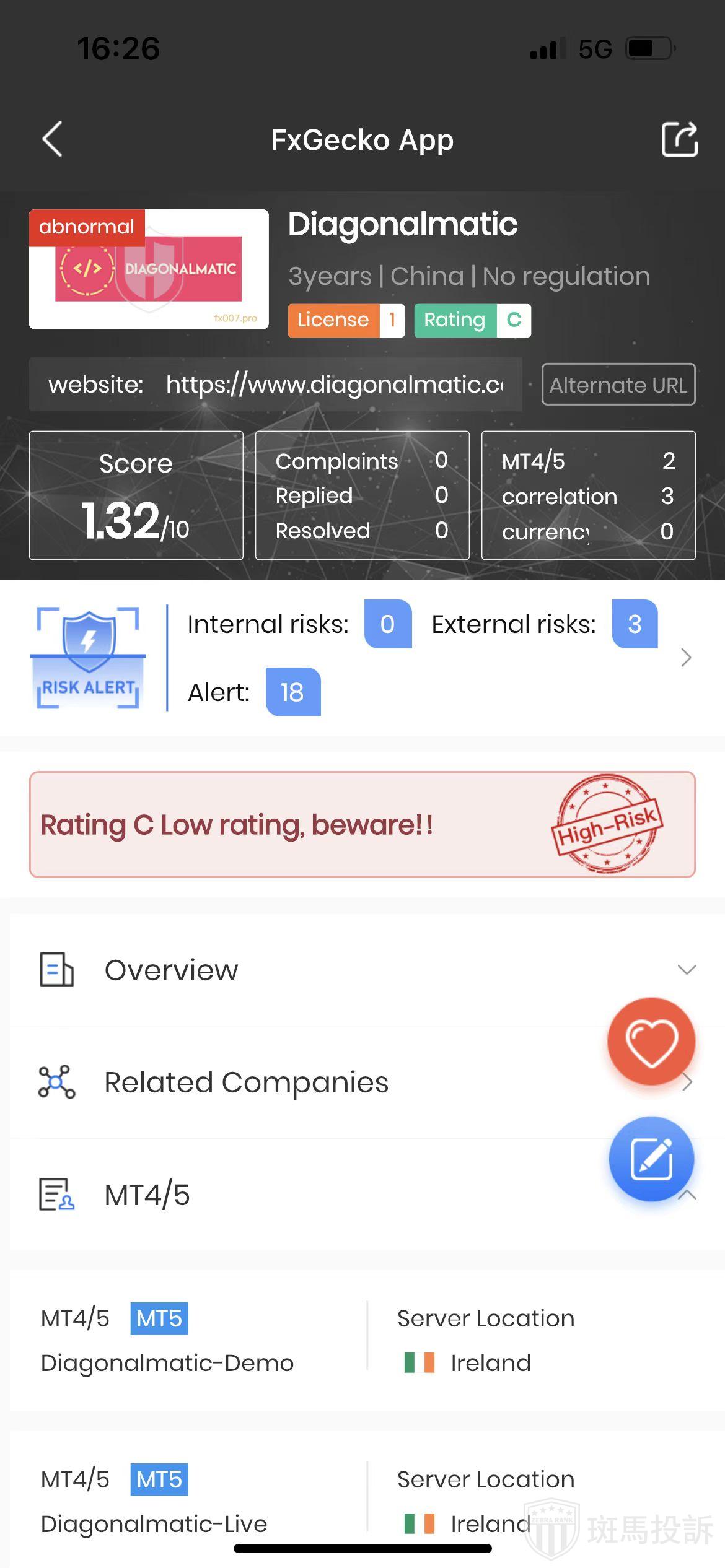 This broker is called Diagonalmatic, which has been established for one year and ranks 4360 in the world. At present, there are 0 foreign exchange licenses, and the risk scan shows 21 risks. Investors need to pay attention to relevant risks.