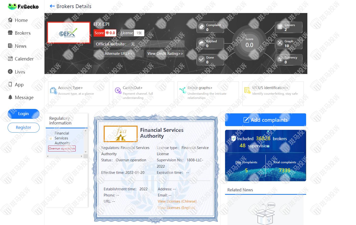 This broker is called EFX CPI, which has been established for one year and ranks 2278 in the world. At present, there is one foreign exchange license, and the risk scan shows ten risks. Investors need to pay attention to relevant risks.