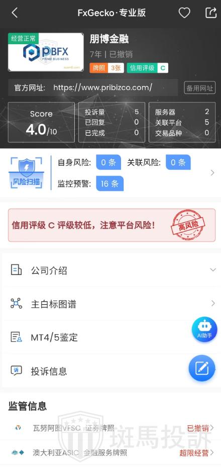 I found some information about the PBFX forex platform. Firstly,Large foreign exchange trading platform PBFX was founded in 2017 and has changed its name to PBFX, which was previously known as ‘PBFX’ and ‘PRIBIZCO’. The company is said to hold a Vanuatu VFSC, an Australian ASIC AR licence and a New Zealand FSP financial services registration licence. However, these licences do not have FX qualifications, and the licence qualifications and ratings are low, with a security score of 40 and a risk scan showing 16 issues.