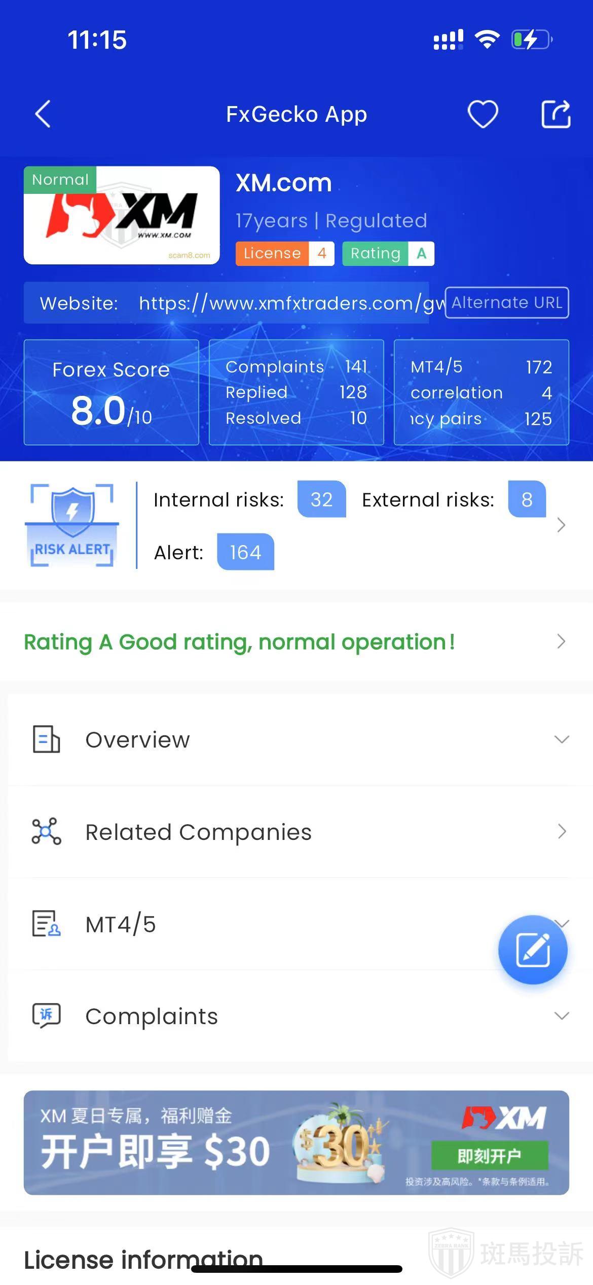 The platform in question is called XM.com, founded in 2008, ranked globally at number 8, with a safety score of 90 points. The platform claims to hold regulatory licenses from four countries.