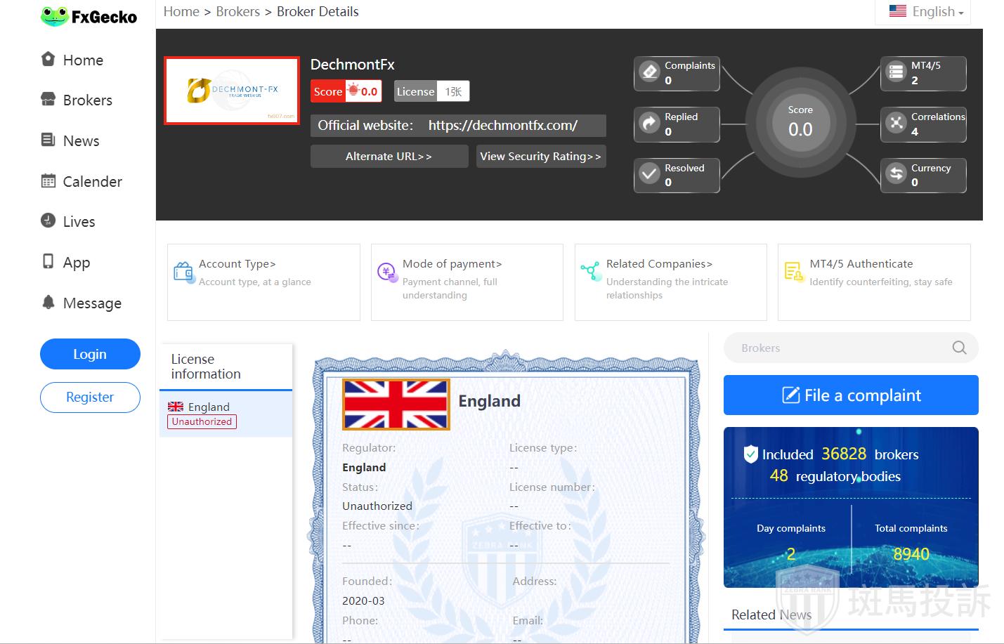 Currently, no valid regulatory information has been found for DechmontFx, which is a high risk sign, beware!
