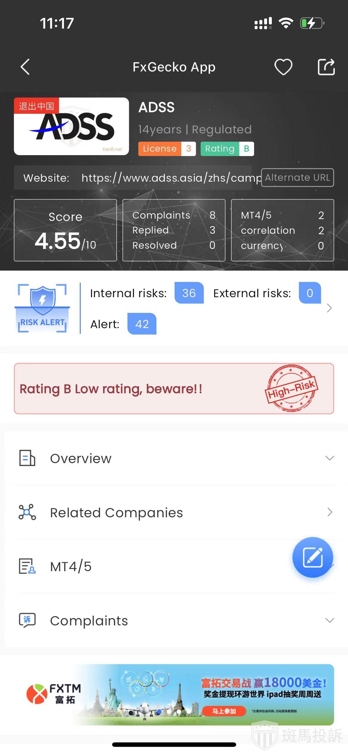 FTI’s inquiry shows that the platform in question is called ADSS, established in 2010, globally ranked at number 302, with a safety score of 70 points. The platform claims to hold regulatory licenses from three countries, and risk scans have identified 78 alerts.