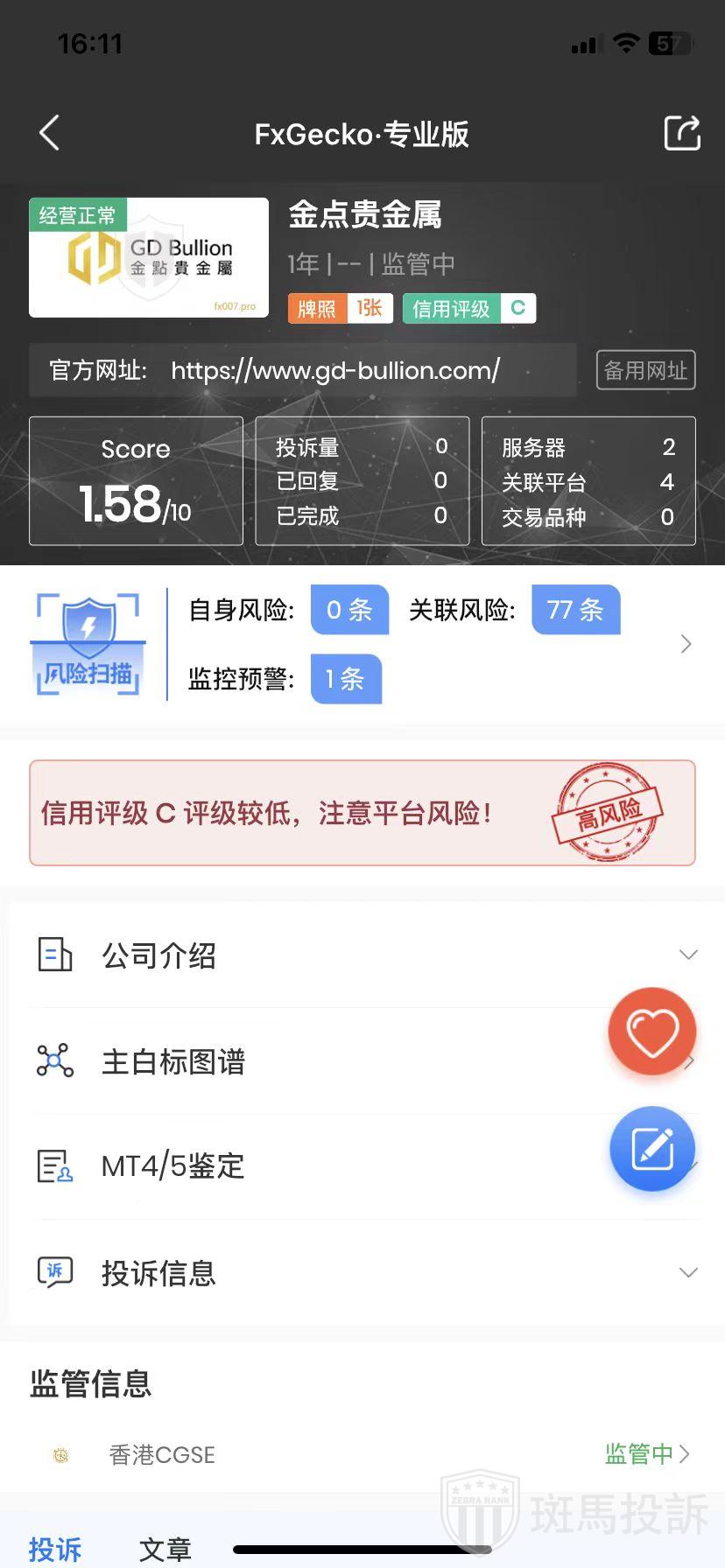 GD Bullion,FTI shows normal operations. The Hong Kong CGSE license it claims to hold is under supervision. I haven't received any relevant complaints yet!