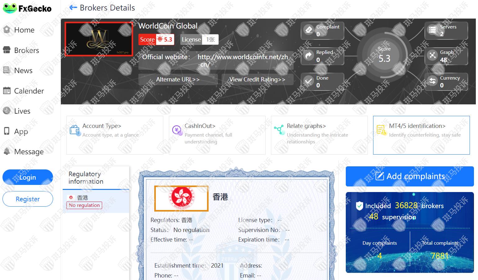 This broker is called WorldCoin Global which was founded less than 2 year ago and is ranked 5057 in the world. At present, there are 0 foreign exchange licenses, and the risk scan shows 4 risks. Investors need to pay attention to relevant risks.