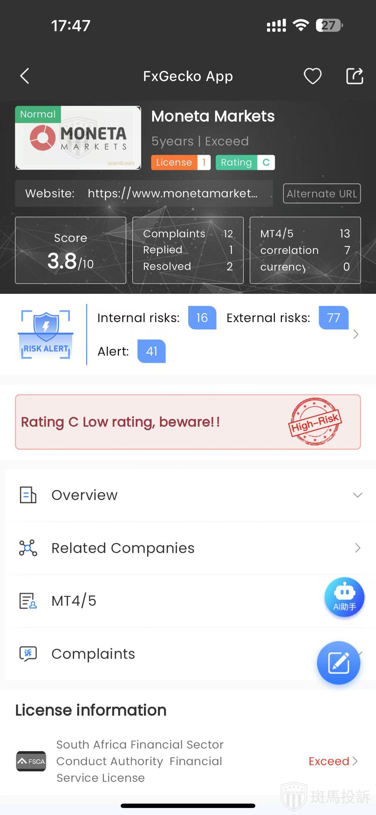 According to FTI, this platform is named Moneta Markets, established in 2020, holding a global ranking of 2885 and a safety score of 40 points. The platform claims to possess a financial services license from South Africa's FSCA, with 134 risk scan alerts noted.