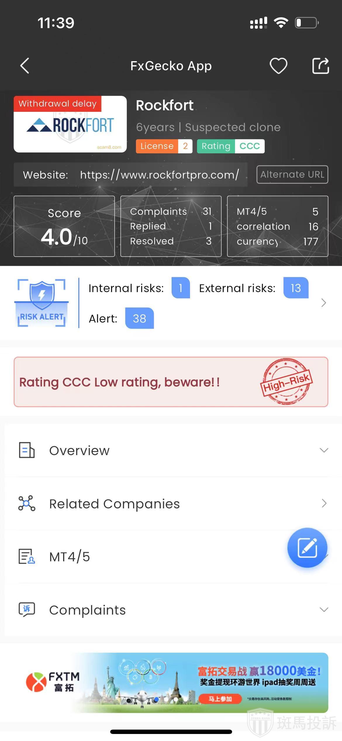FTI Comprehensive Review: The official Rockfort website appears to be inaccessible. Complaints relate to issues such as contract pricing errors or withdrawal problems, suggesting the possibility of a scam. There are many negative comments, and overall reviews are average. The number of trading products is limited, and complaint resolution seems slow.