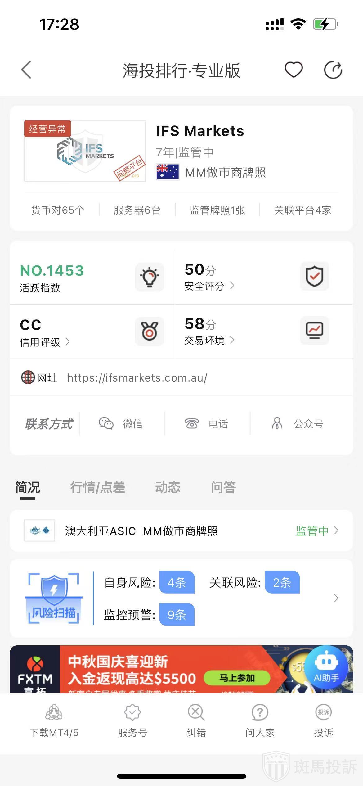 2.**许可证查询**:可以通过相关网站(如海投)查询IFS Markets是否持有有效的经营许可证,并查看其是否在监管机构的名录中。如果没有找到相关信息,建议提高警惕。