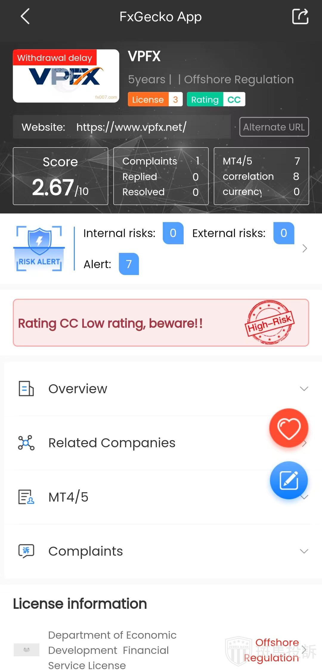 FTI risk warning shows that VPFX has 5 risks. Investors need to pay attention to the relevant risk alerts for this broker.