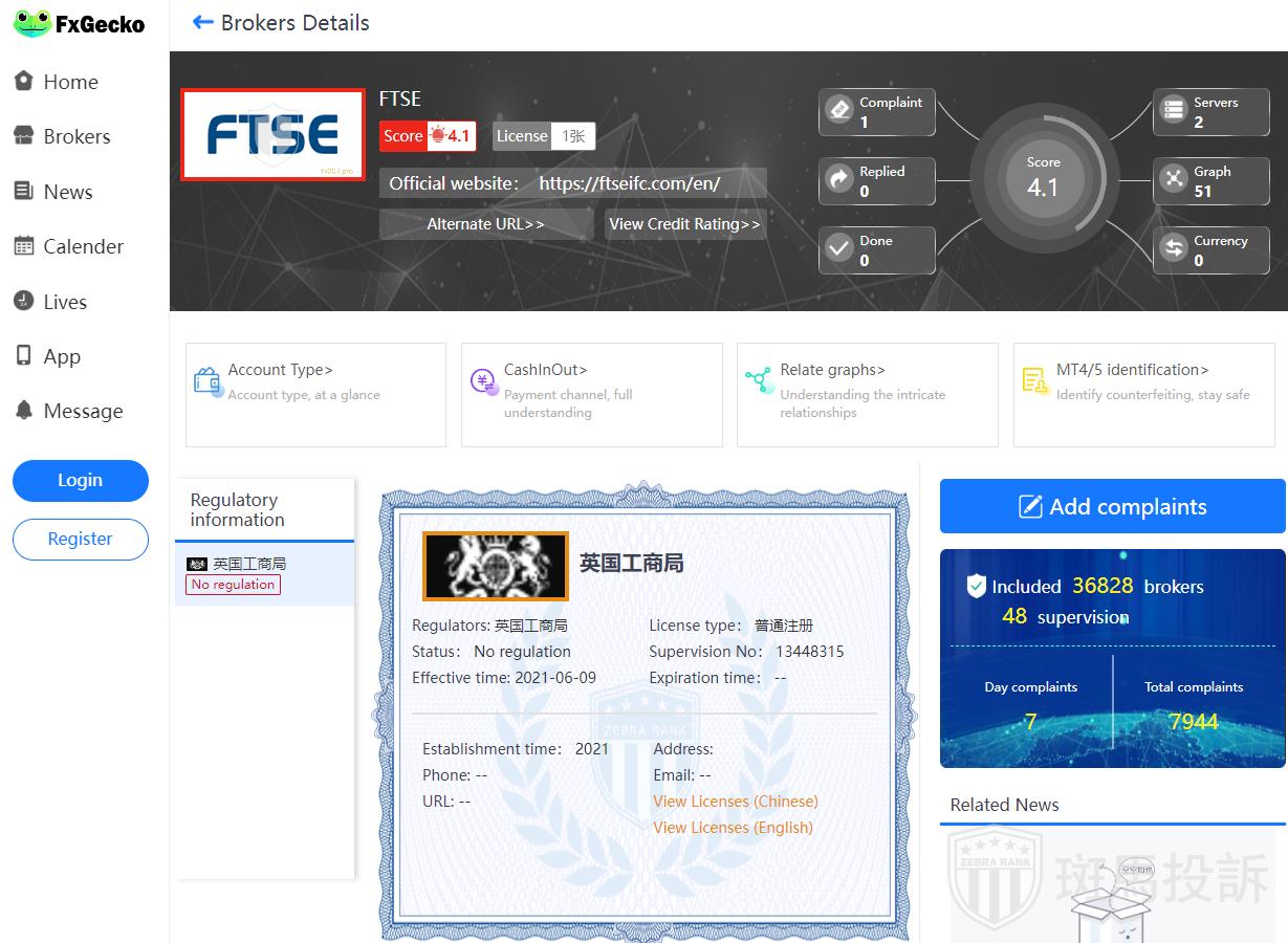 This broker is called FTSE, which has been established for one year and ranks 2679 in the world. At present, there are 1 foreign exchange licenses, and the risk scan shows 17 risks. Investors need to pay attention to relevant risks.