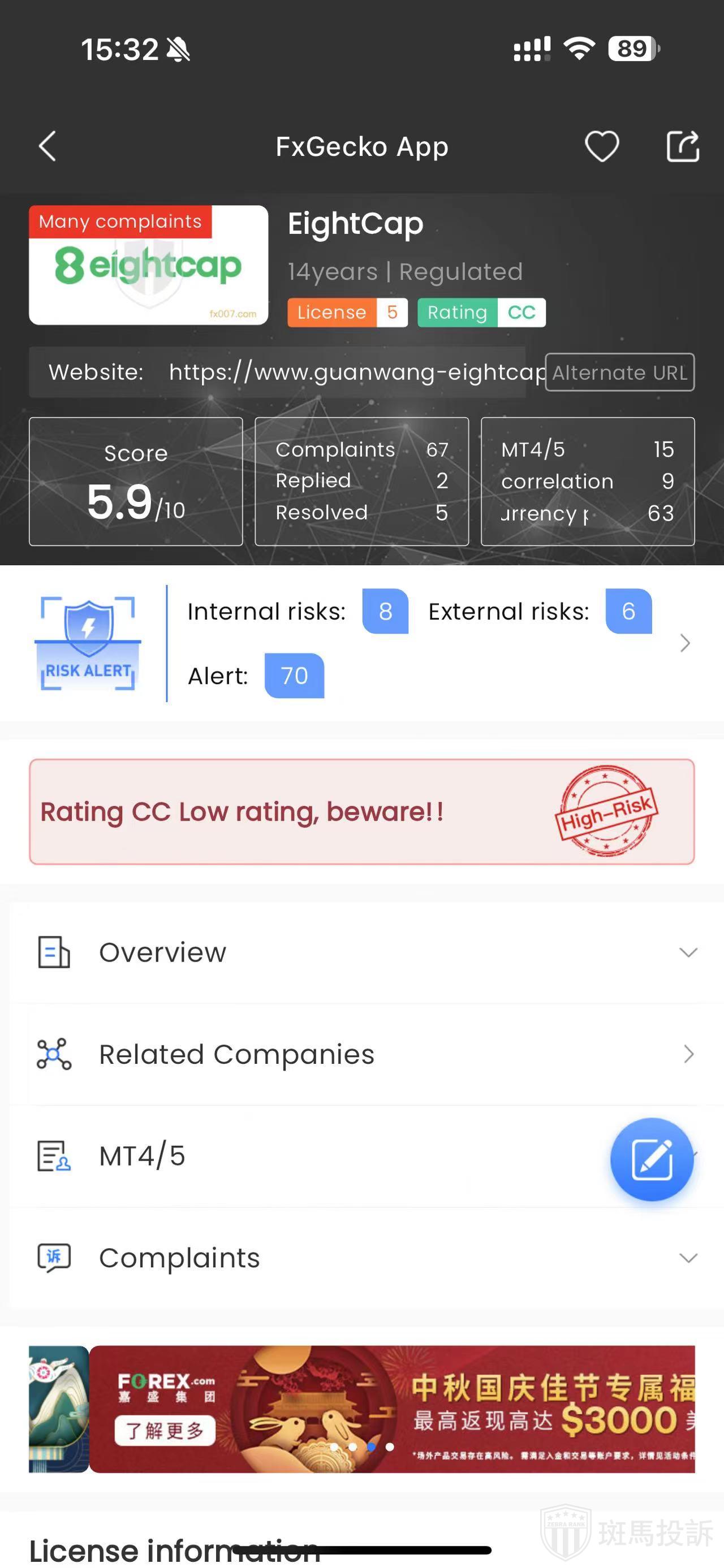 FTI risk warning shows that EightCap has 87 risks. Investors need to pay attention to the relevant risk alerts for this broker.