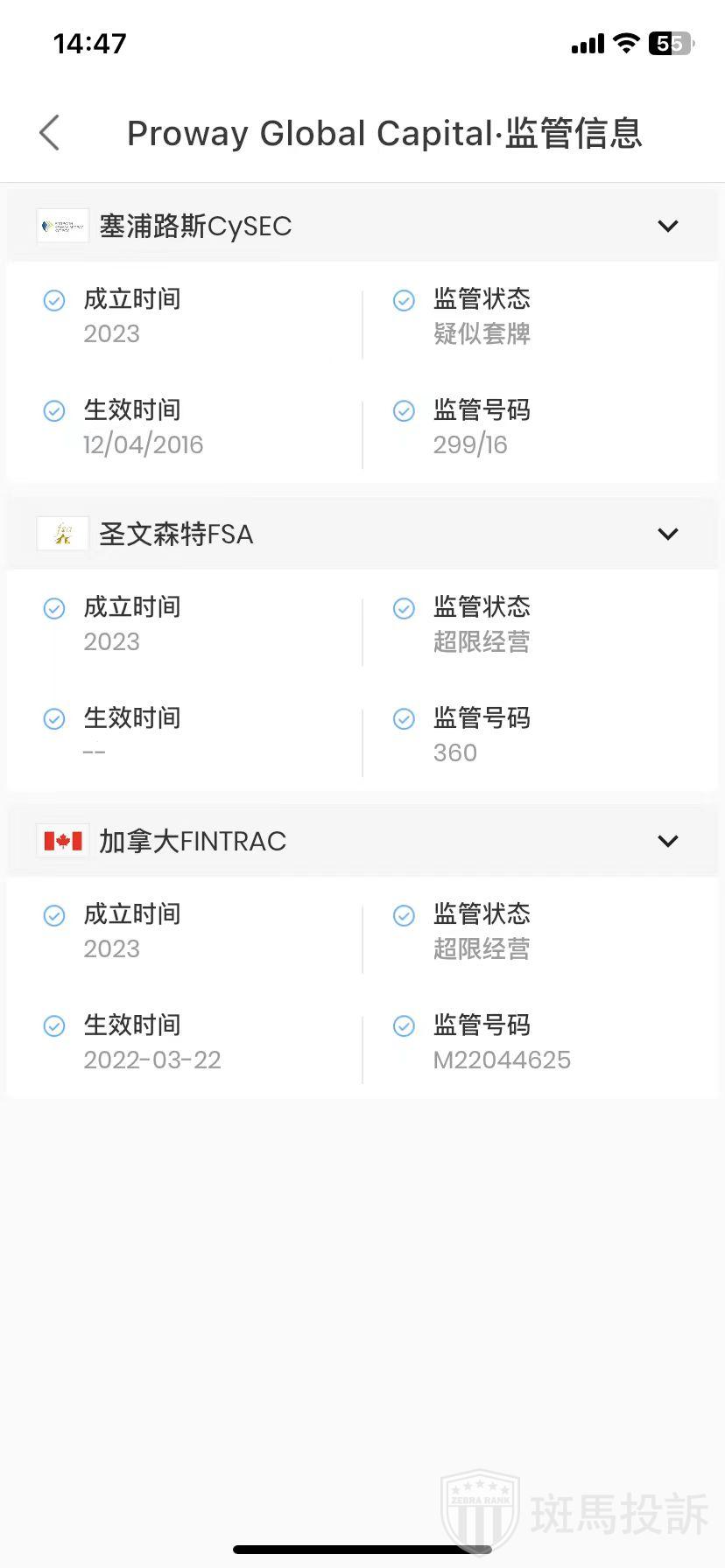 Proway Global Capital displays regulatory information for three companies on FTI. The regulatory status of CySEC held in Cyprus is suspected to be a deck; The regulatory status of Saint Vincent FSA and Canada FINTRAC is over limit operation. The safety of investor funds is not guaranteed!