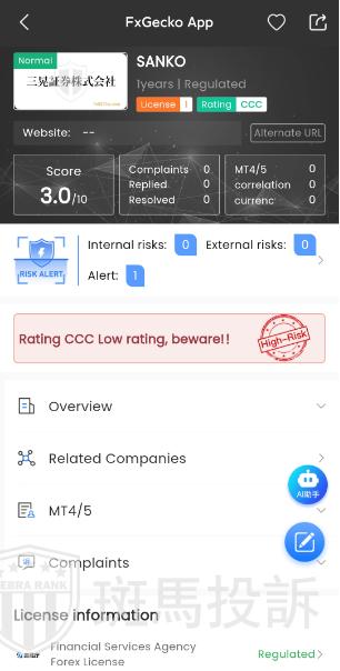 FTI risk warning shows that 三晃证券SANKO has 1 risks. Investors need to pay attention to the relevant risk alerts for this broker.