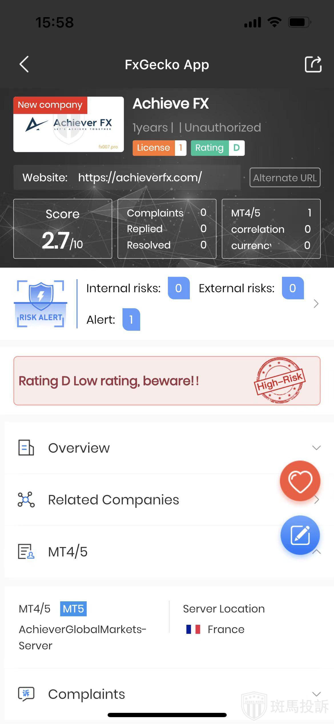 FTI risk warning shows that Achieve FX has 1 risks. Investors need to pay attention to the relevant risk alerts for this broker.
