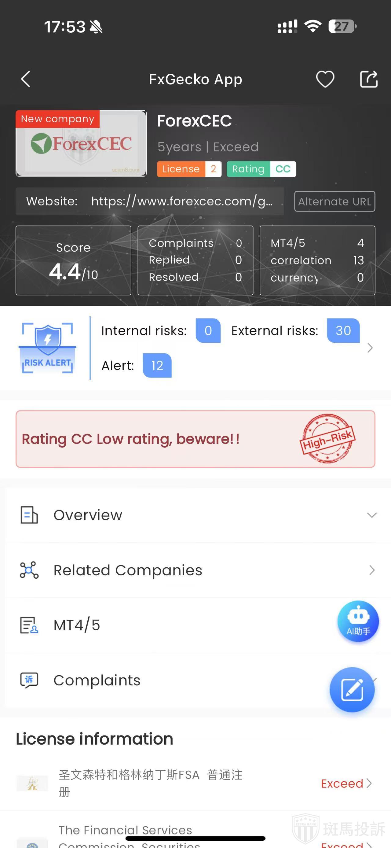 According to FTI's inquiry, this platform named ForexCEC was established in 2020, ranking 1539th globally with a safety score of 50 points. It currently holds two regulatory licenses: a general registration from the Financial Services Authority (FSA) of Saint Vincent and the Grenadines and a securities license from the Financial Services Commission (FSC) of Mauritius. There are 42 risk scan alerts associated with it.