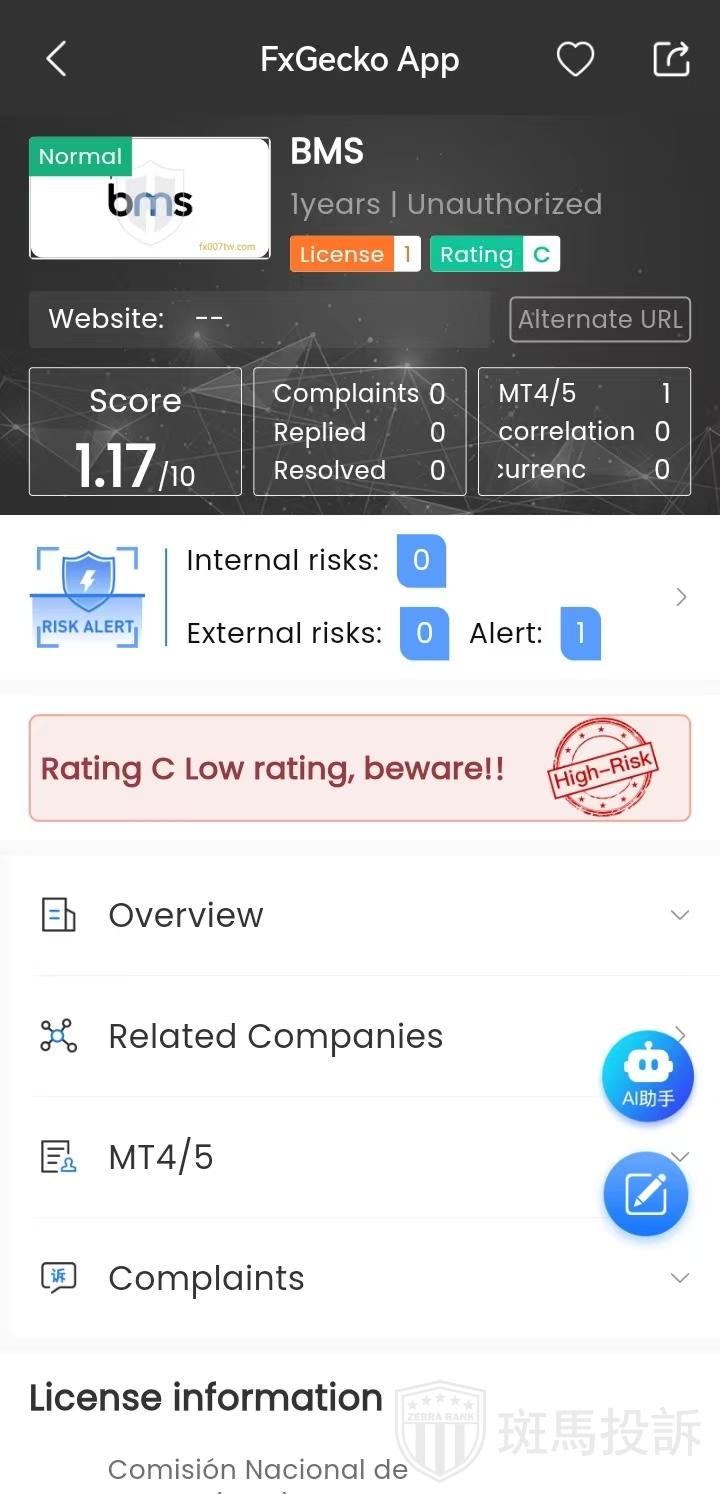 FTI risk warning shows that BMS has 1 risks. Investors need to pay attention to the relevant risk alerts for this broker.