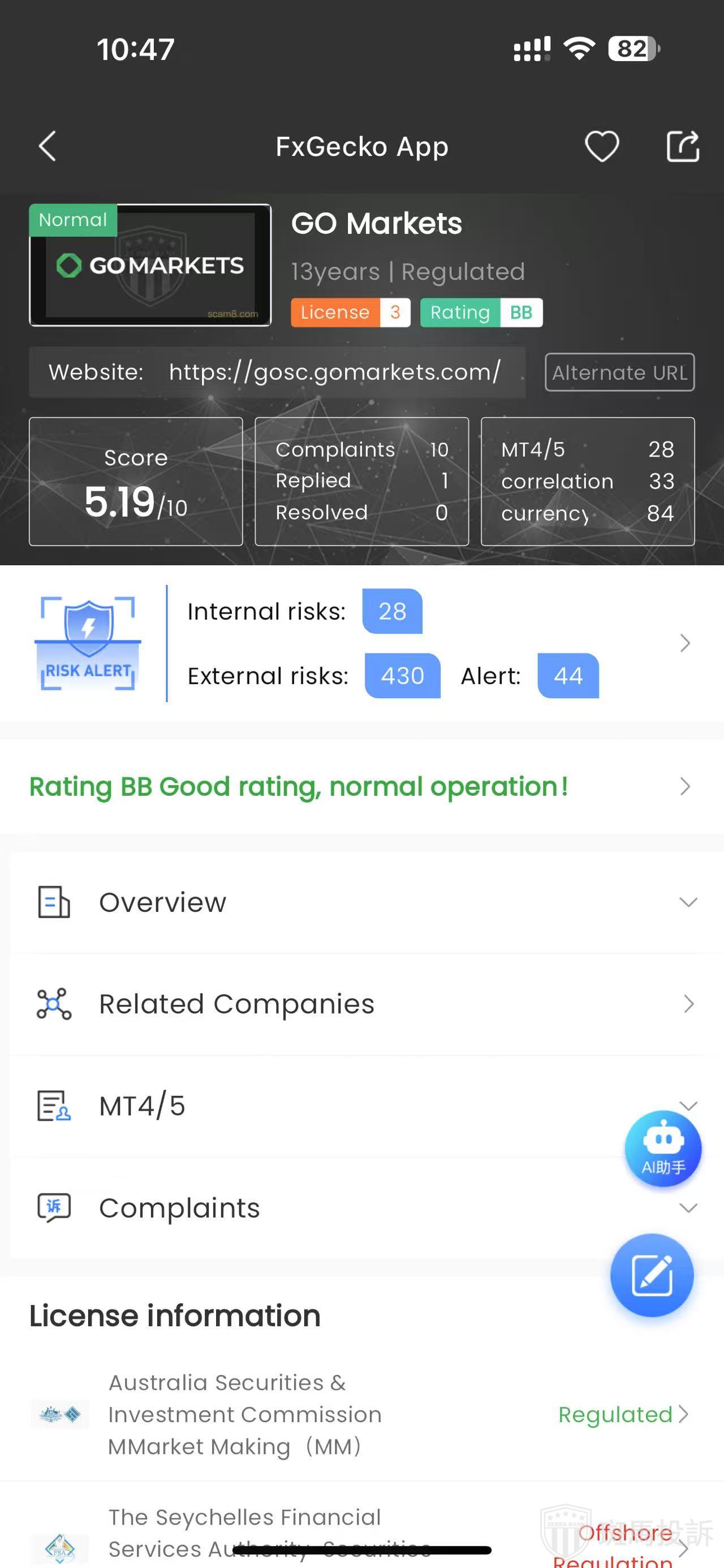 FTI's query shows that this platform, known as GO Markets, was established in 2012, ranks 133rd globally, has a safety score of 80, claims to hold regulatory licenses from three countries, and has 480 risk scan alerts. Regarding GO Markets, there are two distinctly different voices.