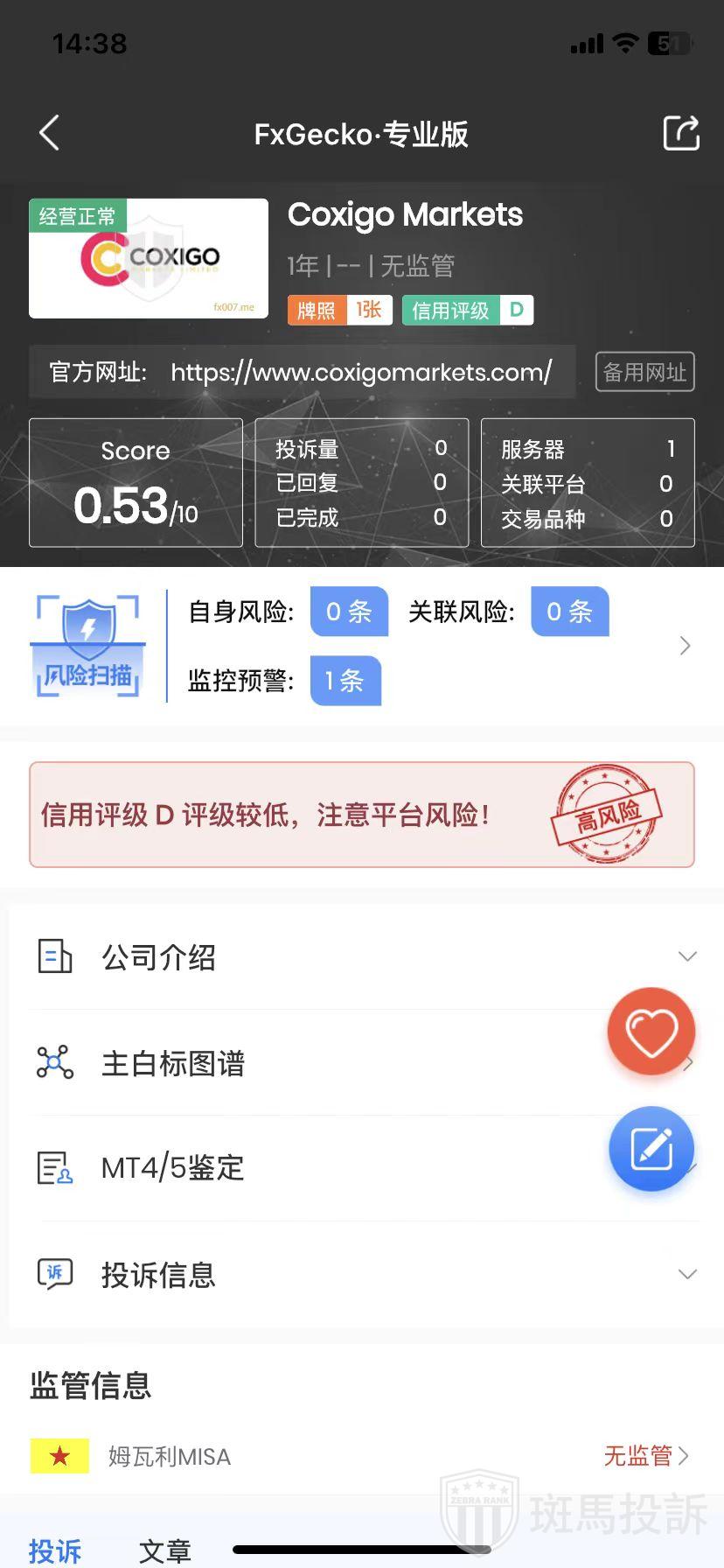 The new platform Coxigo Markets scored 0.53 points FTI warning:be away from