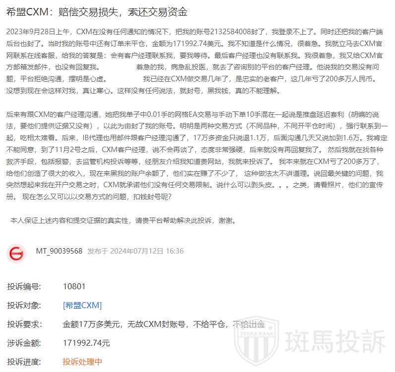 As a loyal customer of CXM for several years, the investor had incurred losses exceeding 2 million RMB during this period. The sudden and unjustified account suspension, coupled with the withholding of funds, has left them deeply disillusioned and frustrated.