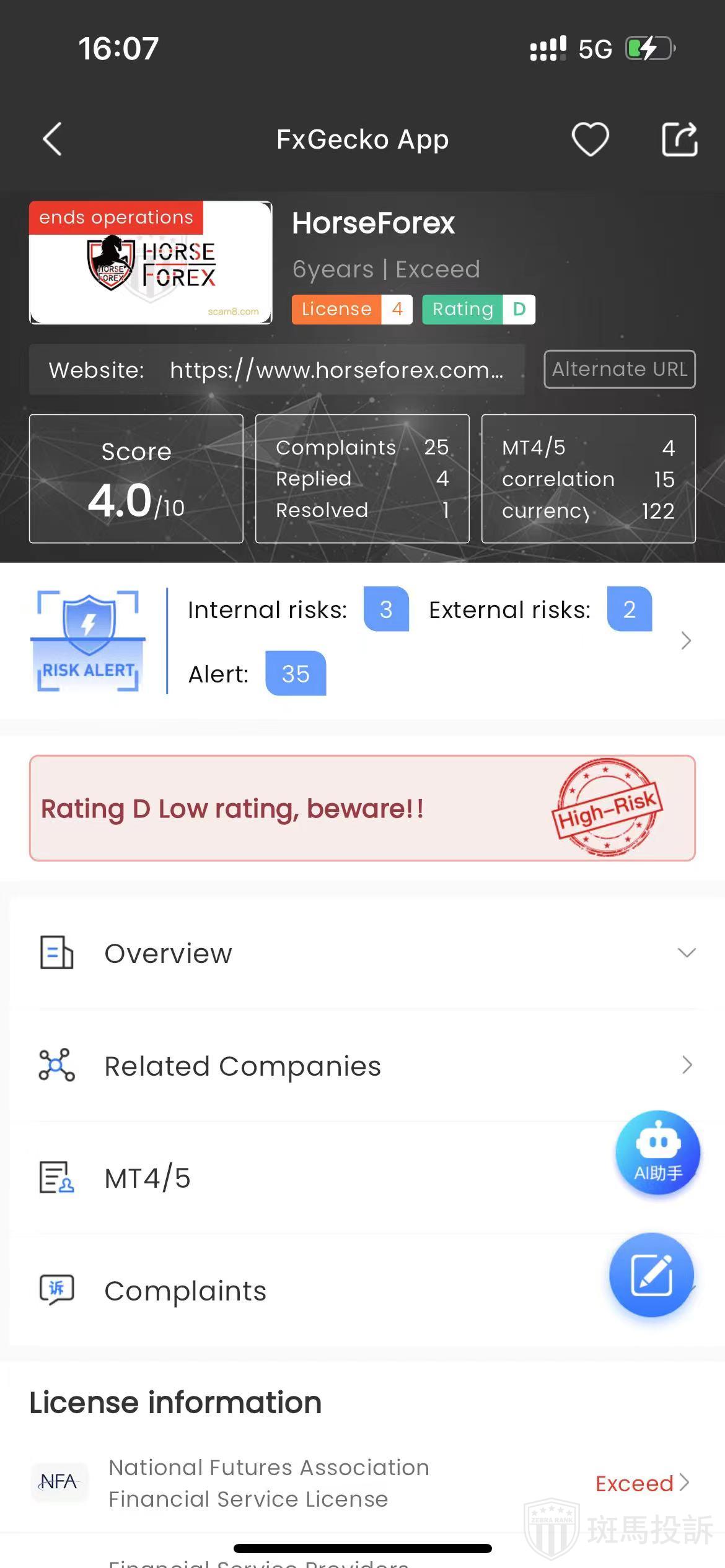 According to FTI's query, the platform in question is called HorseForex, established in 2019, ranking globally at 5467 with a safety score of 30. The platform claims to hold regulatory licenses from four countries. However, there are 40 risk alerts associated with it.