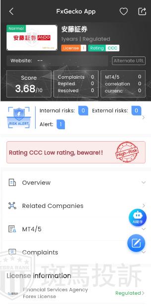 FTI risk warning shows that Ando Securities安藤証券 has 1 risks. Investors need to pay attention to the relevant risk alerts for this broker.