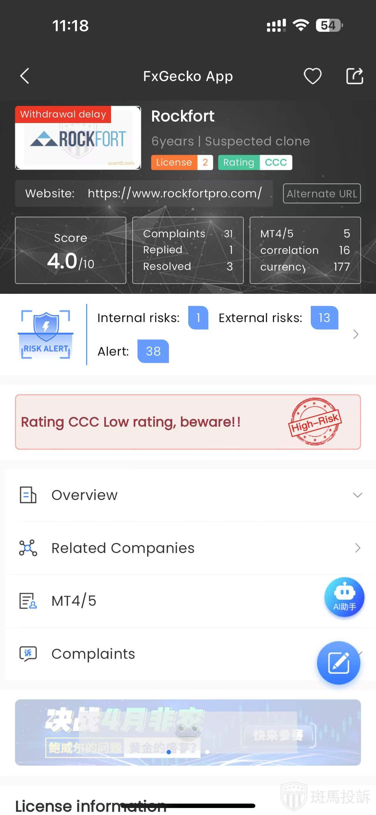 FTI's Comprehensive Review: Currently, Rockfort's official website appears to be inaccessible. Complaints revolve around issues such as incorrect contract quotations or withholding withdrawals, suggesting potential business closure. There are numerous negative reports, overall reviews are average, the variety of trading instruments is limited, and complaint handling is slow.