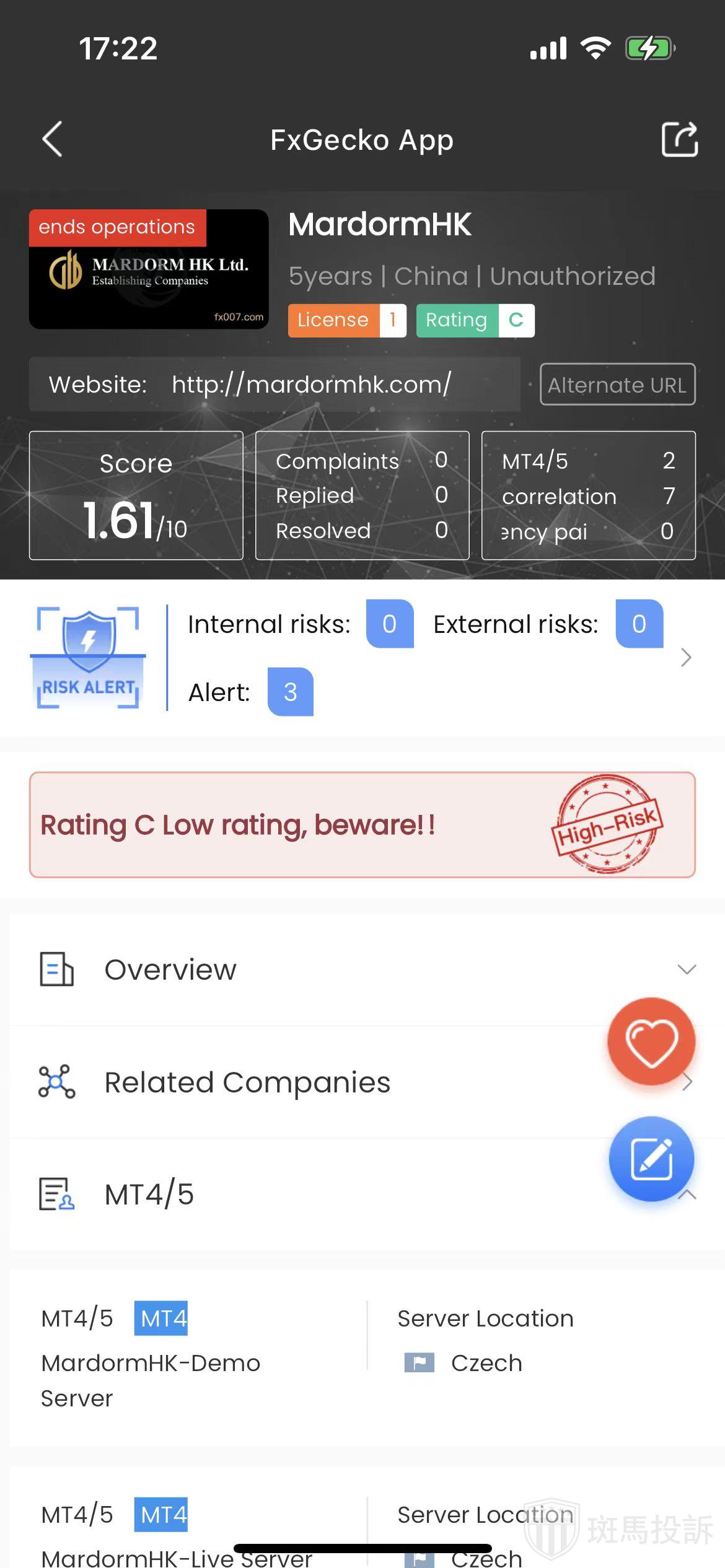FTI risk warning shows that MardormHK has 3 risks. Investors need to pay attention to the relevant risk alerts for this broker.