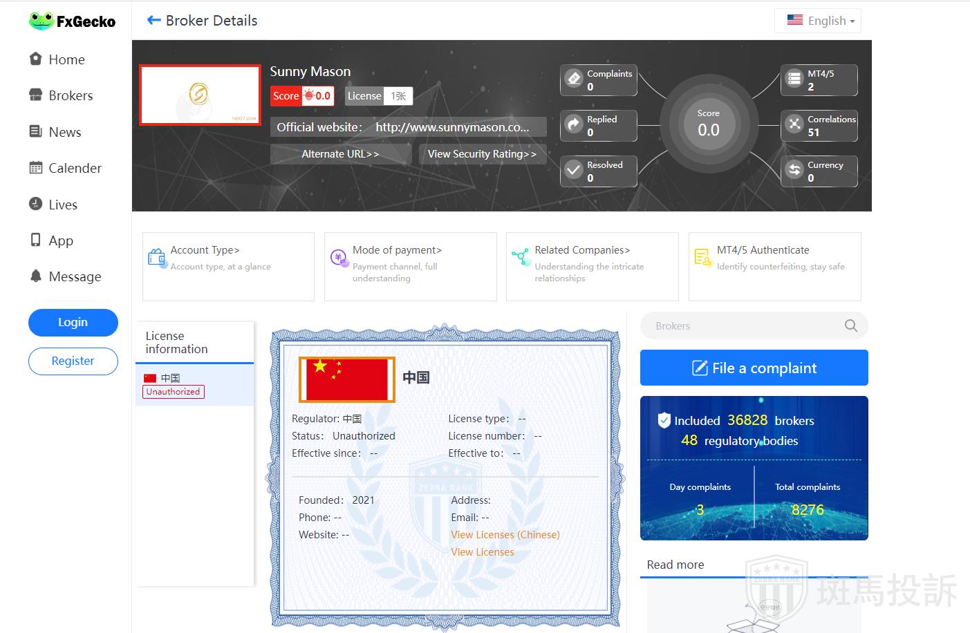 This broker is called Sunny Mason, which has been established for one year and ranks 3535 in the world. At present, there is no foreign exchange license,and the risk scan shows 10 risks.Investors need to pay attention to relevant risks.