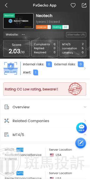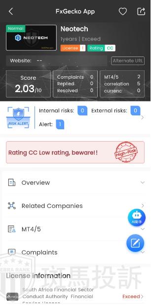 FTI risk warning shows that Neotech has 1 risks. Investors need to pay attention to the relevant risk alerts for this broker.