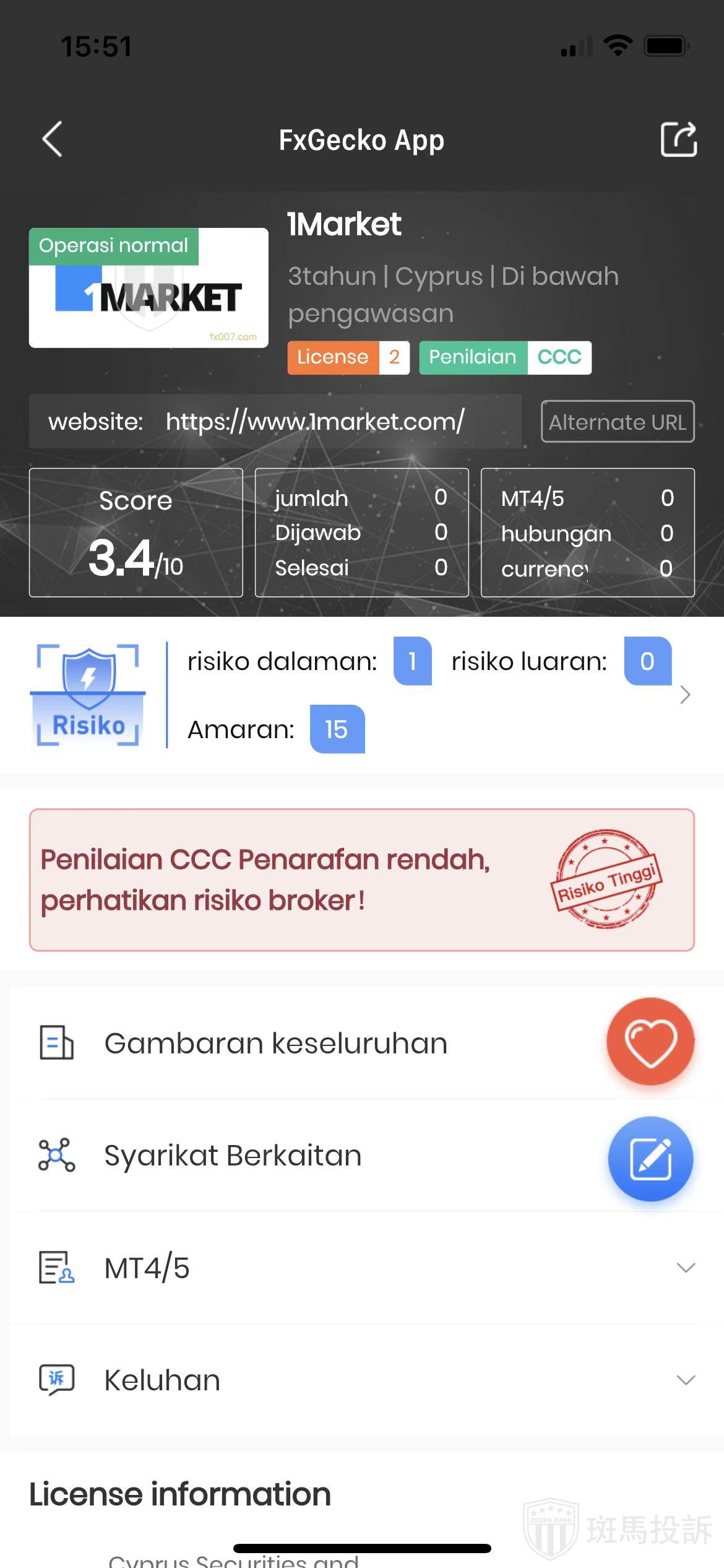 This broker is called 1Market, which has been established for one year and ranks 852 in the world. At present, there are 2 foreign exchange licenses, and the risk scan shows 16 risks. Investors need to pay attention to relevant risks.
