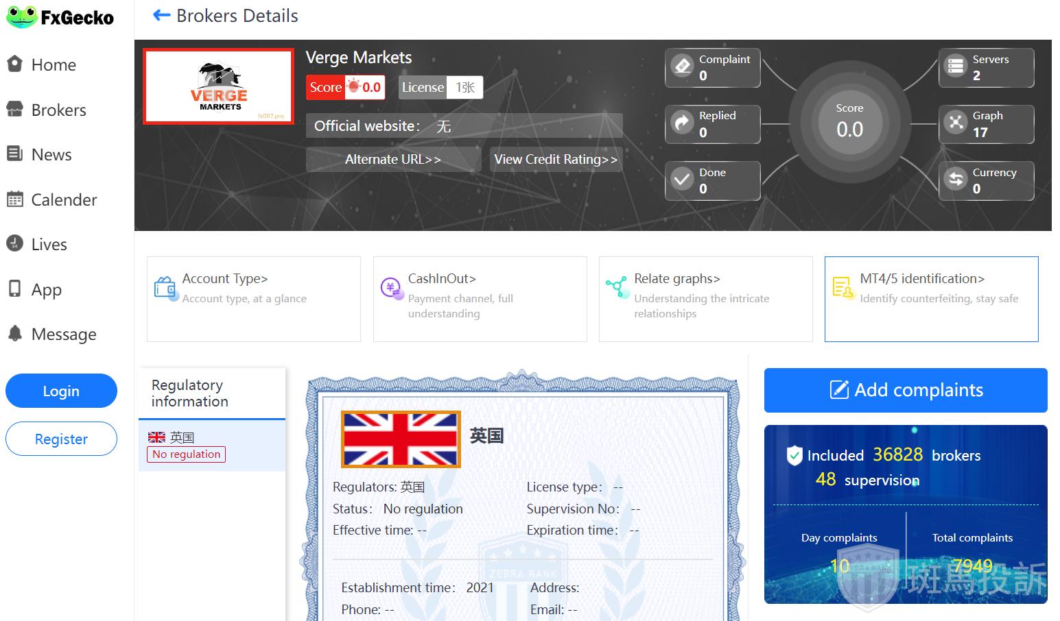 This broker is called Verge Markets which was founded less than 2 year ago and is ranked 3146 in the world. At present, there are 0 foreign exchange licenses, and the risk scan shows 15 risks. Investors need to pay attention to relevant risks.