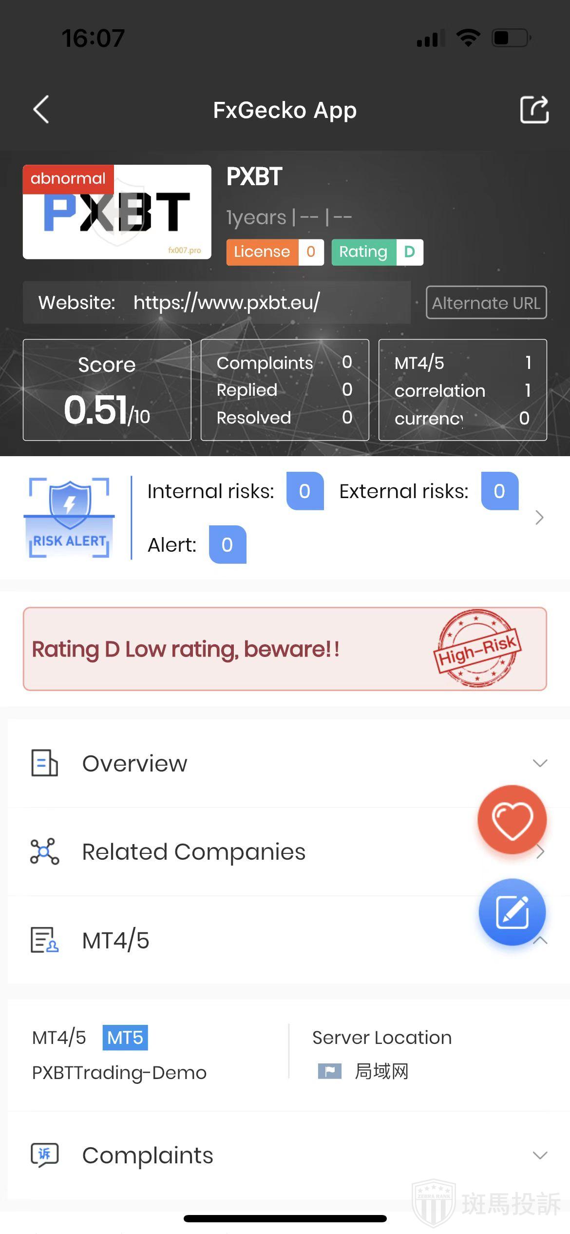 FTI risk warning shows that PXBT has 0 risks. Investors need to pay attention to the relevant risk alerts for this broker.