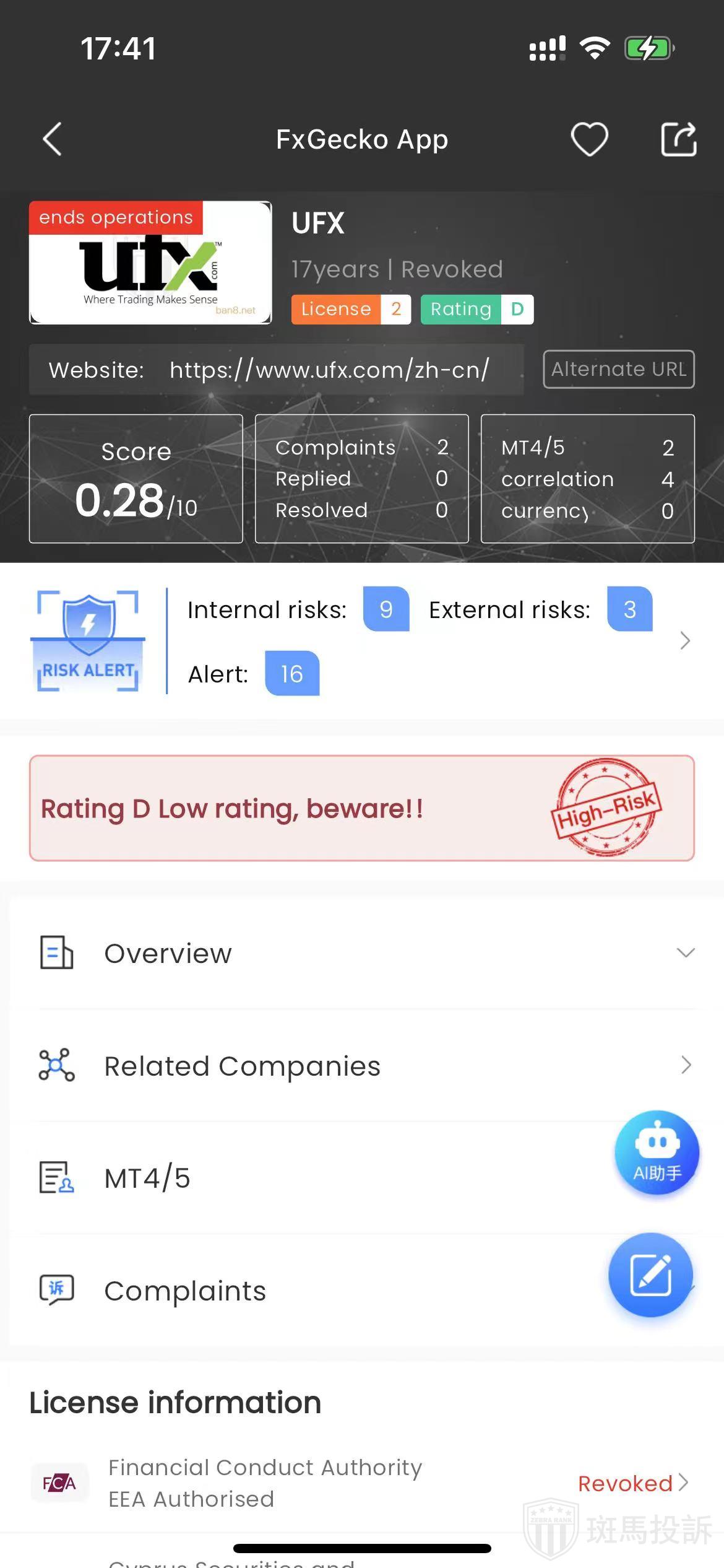 According to FTI's inquiry, the platform known as UFX was established in 2007 and ranks globally at 6,619 with a safety score of 30 points. The platform claims to have held two regulatory licenses which have been revoked, with 28 risk scan alerts issued.