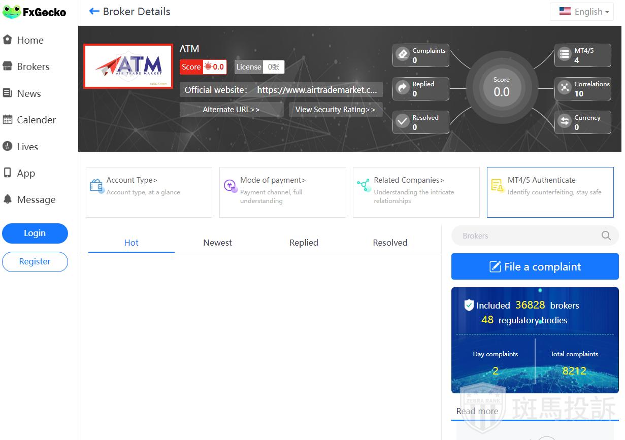 This broker is called ATM, which has been established for one year and ranks 4405 in the world. At present, there are 0 foreign exchange licenses, and the risk scan shows 12 risks. Investors need to pay attention to relevant risks.