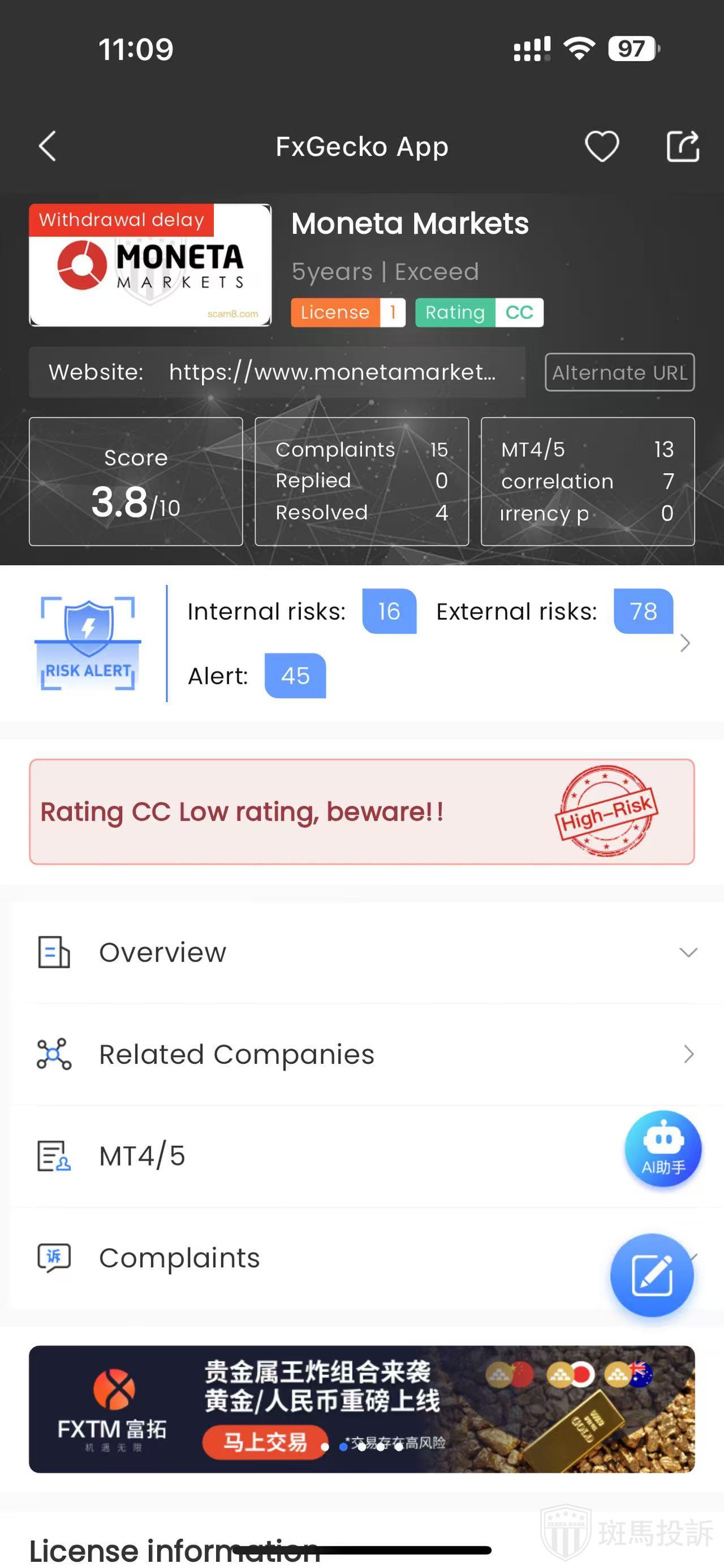 FTI's comprehensive review: Moneta Markets' official website operates normally, but complaints arise mainly due to contract quotation errors or delayed deposits affecting trading environments—these aspects should be noted. There are more negative comments, and overall reviews are average. The platform offers a variety of trading instruments, yet complaint handling is relatively slow.