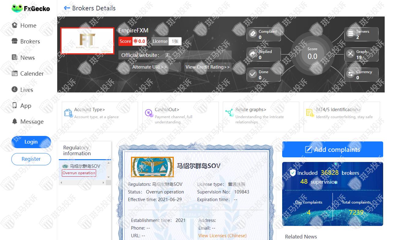 This broker is called EmpireFXM, which has been established for one year and ranks 1933 in the world. At present, there are 1 foreign exchange licenses, and the risk scan shows 4 risks. Investors need to pay attention to relevant risks.