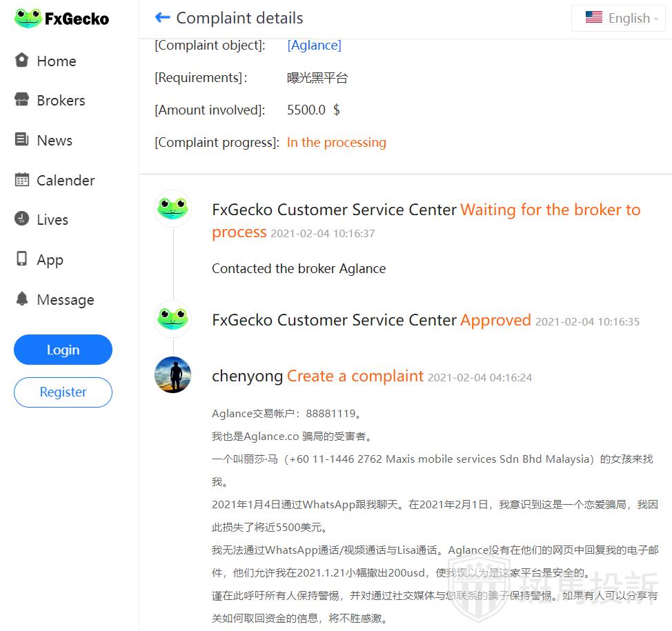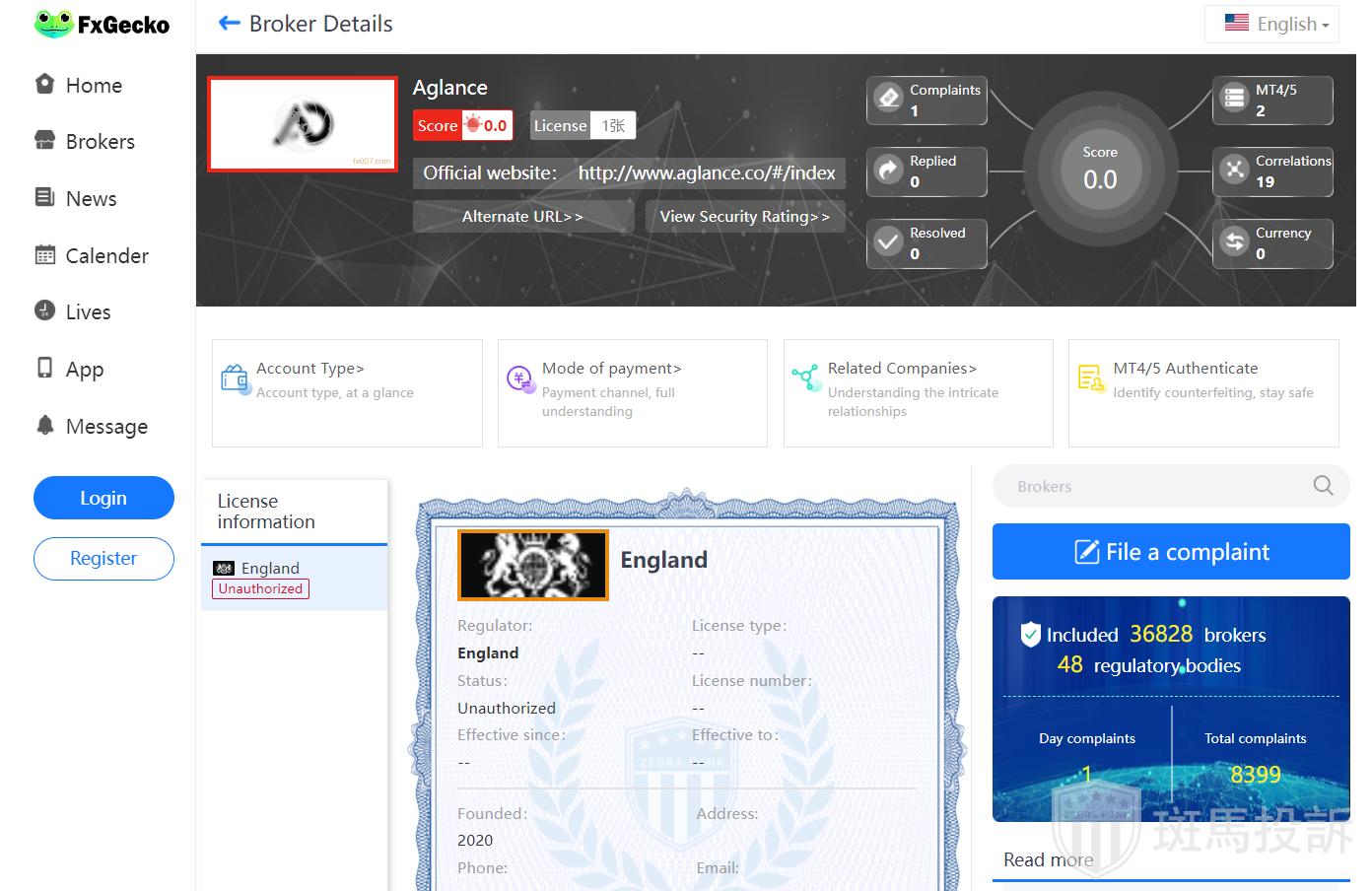 This broker is called Aglance which was founded 3 years ago and is ranked 4575 in the world. Currently, no valid licensing information has been found for Aglance, which is a high risk sign, beware!