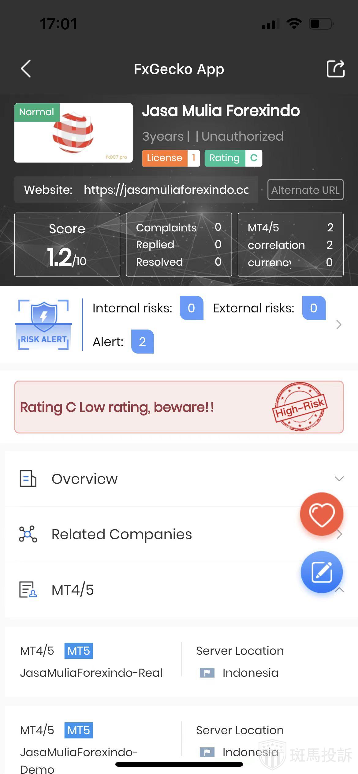 FTI risk warning shows that Jasa Mulia Forexindo has 2 risks. Investors need to pay attention to the relevant risk alerts for this broker.