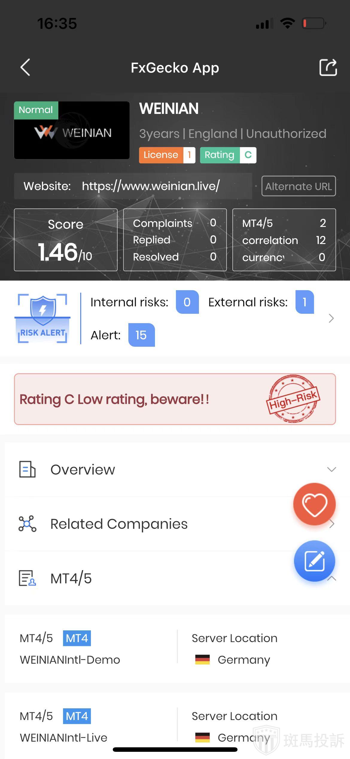 This broker is called WEINIAN, which has been established for one year and ranks 3529 in the world. At present, there are 0 foreign exchange licenses, and the risk scan shows 16 risks. Investors need to pay attention to relevant risks.