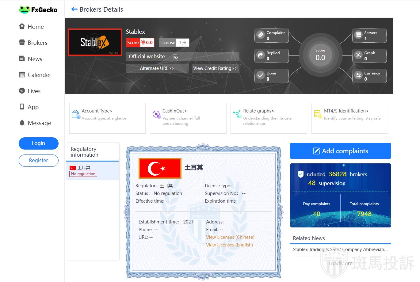 This broker is called Stablex, which has been established for one year and ranks 5446 in the world. At present, there is no foreign exchange license,and the risk scan shows 10 risks.Investors need to pay attention to relevant risks.