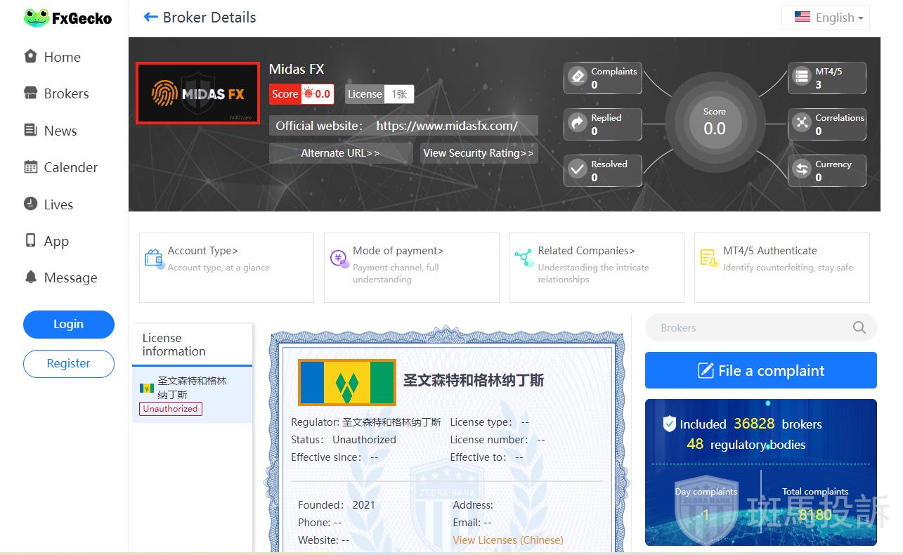 This broker is called Midas FX, which has been established for one year and ranks 4401 in the world. At present, there are 0 foreign exchange license, and the risk scan shows 1 risk. Investors need to pay attention to relevant risks.