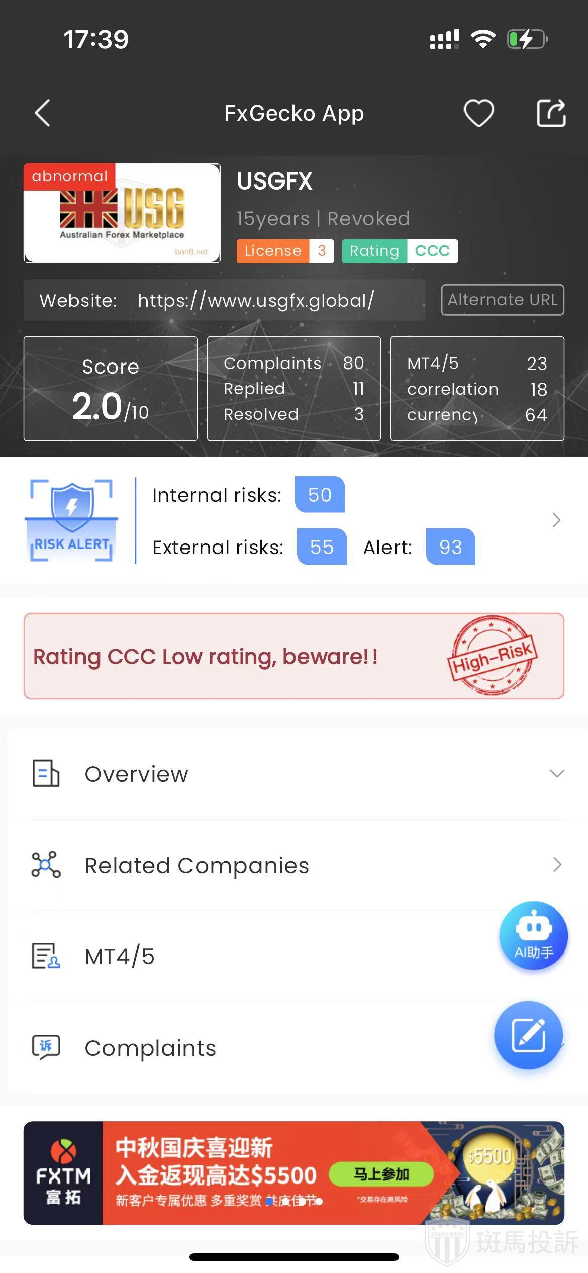 According to FTI, this platform is known as USGFX, established in 2010, ranked globally at 780th place, with a safety score of 60 points, claiming to hold forex licenses from three countries, and has 198 risk scan records.