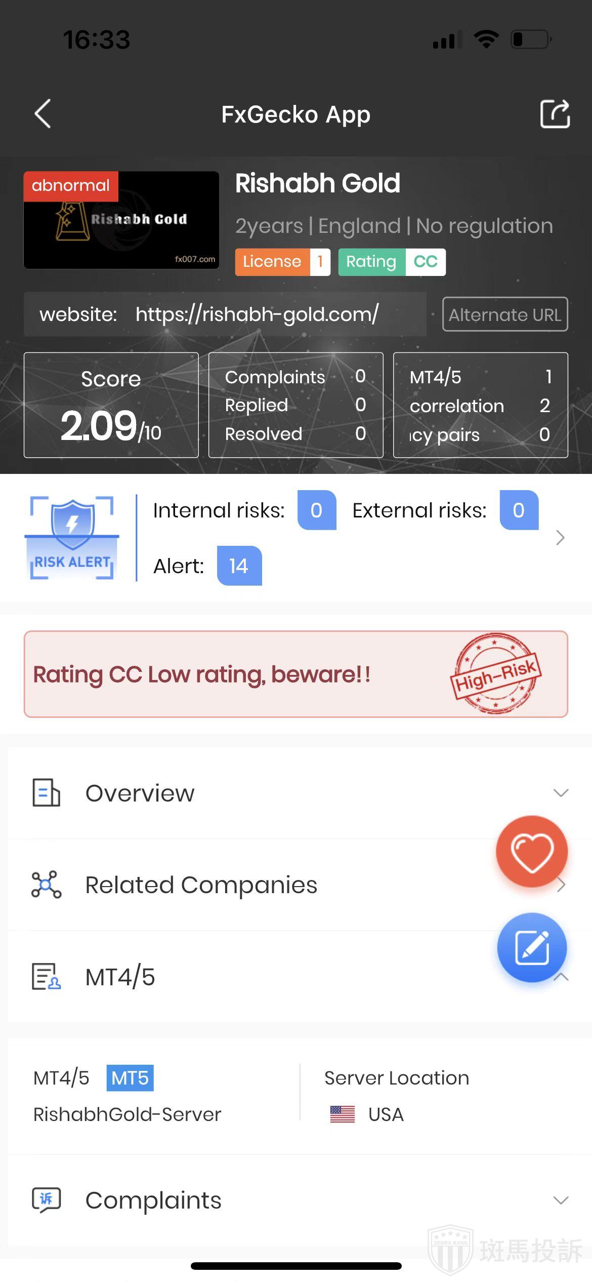 This broker is called Rishabh Gold, which has been established for one year and ranks 1929 in the world. At present, there are 0 foreign exchange licenses, and the risk scan shows 14 risks. Investors need to pay attention to relevant risks.