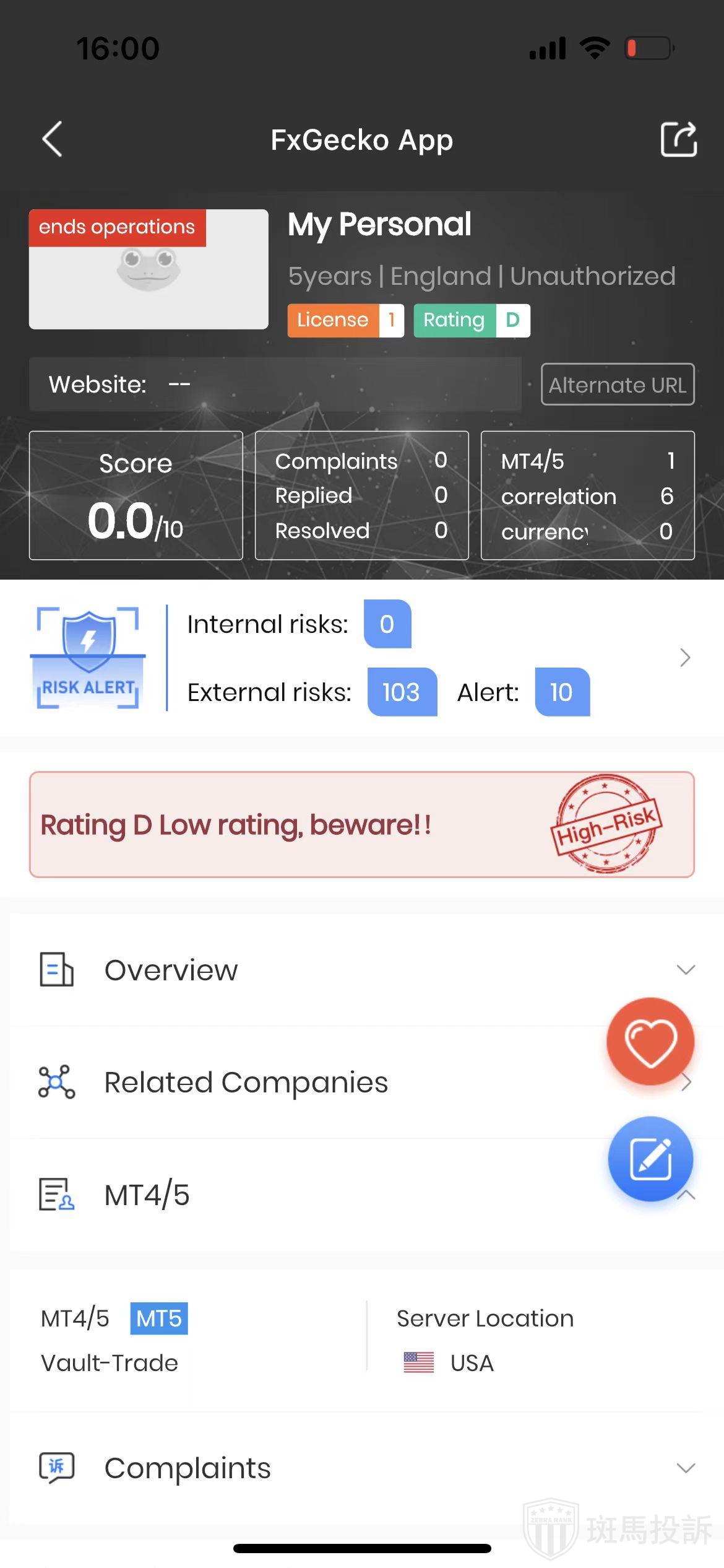 FTI risk warning shows that My Personal has 113 risks. Investors need to pay attention to the relevant risk alerts for this broker.