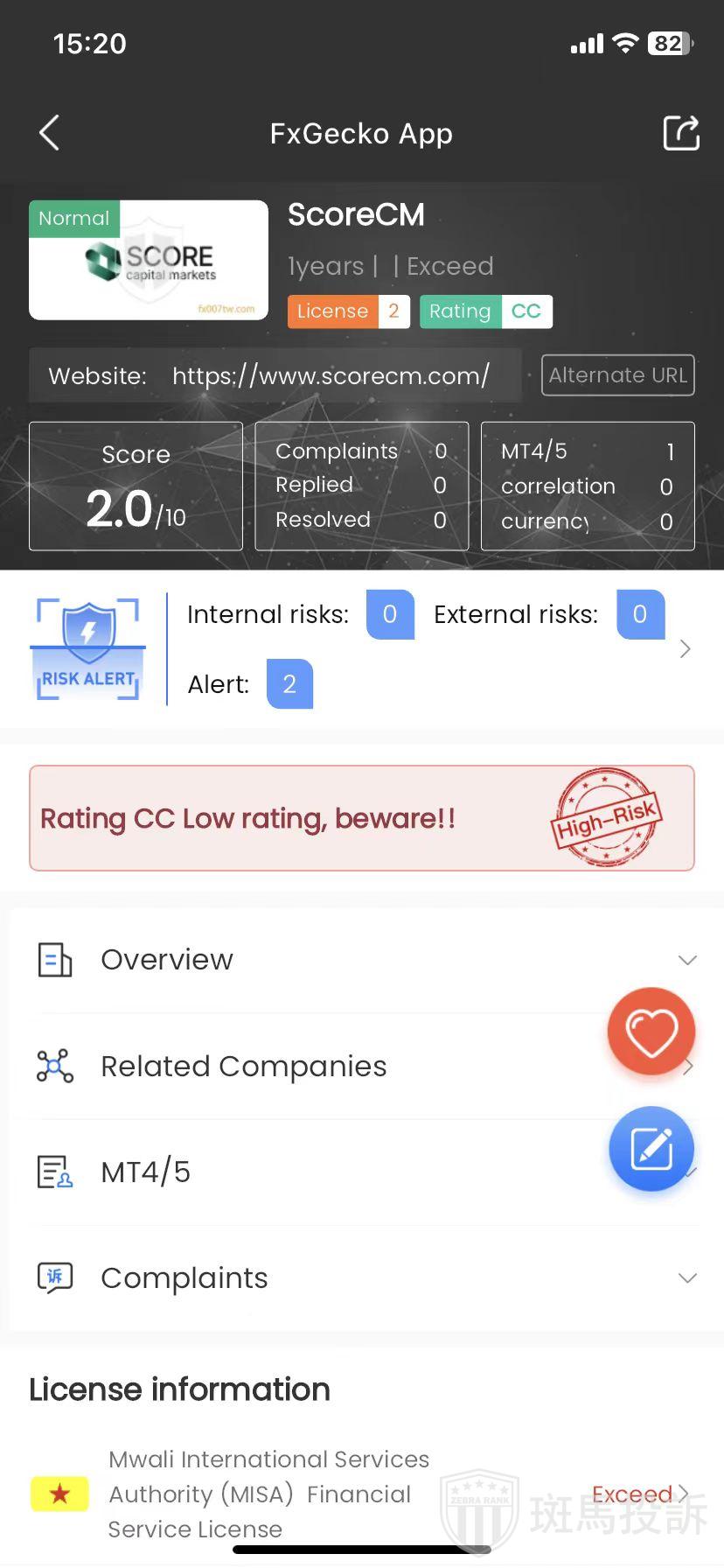 According to FTI, ScoreCM holds only one regulatory license from Mwali MISA, but it is operating beyond its authorized scope, posing a significant threat to investor fund security. FTI has issued a monitoring alert and assigned ScoreCM a low credit rating of 2.0 out of 10, strongly advising investors to stay away.