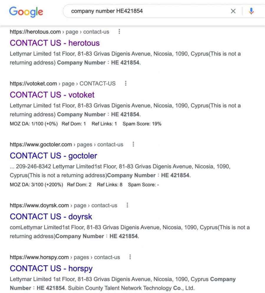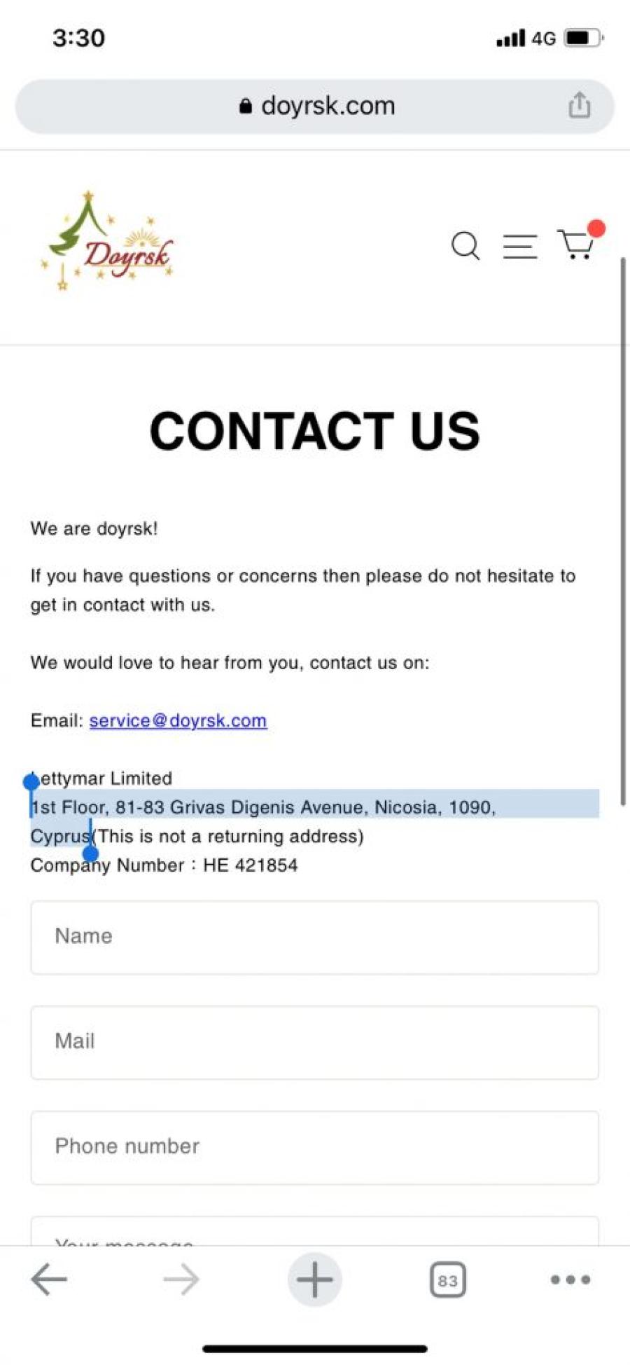 You can find a contact email and an address on the CONTACT US page for doyrsk.com. However, when we searched for the company number on Google, we found that several online shopping websites share the same company address and number — that’s a red flag, right?