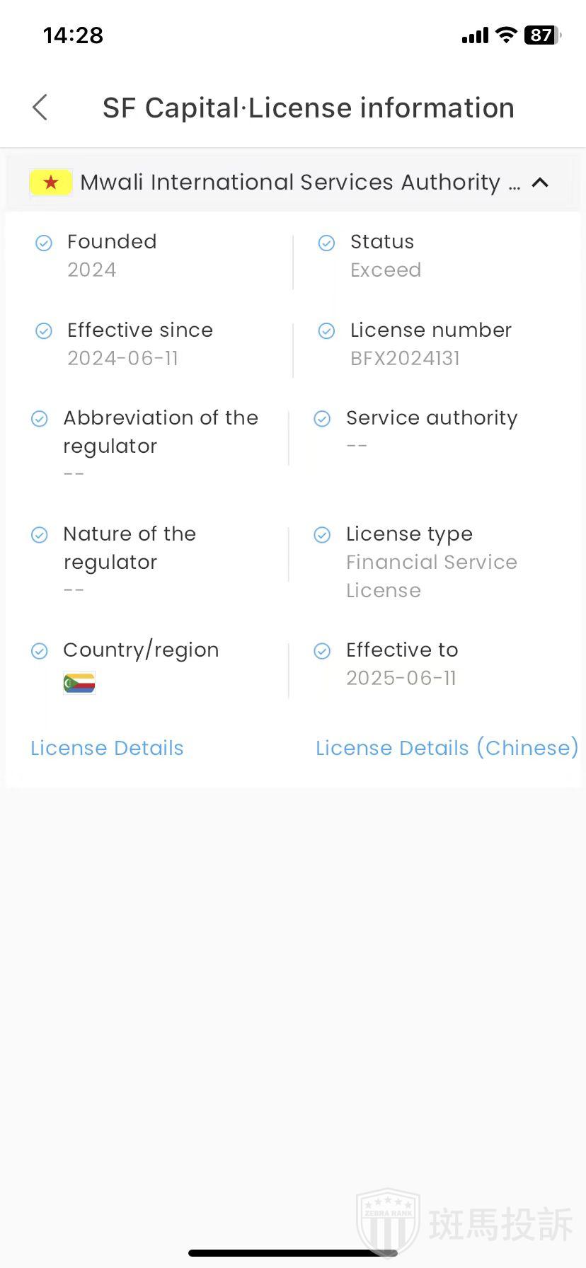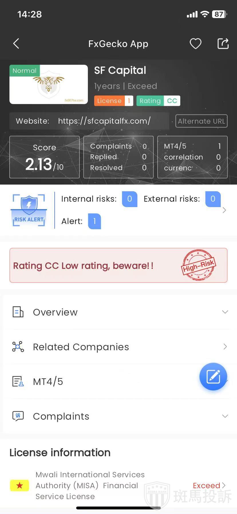 SF Capital is listed with one regulatory information on FTI. The regulatory status with MISA indicates operating beyond limits, compromising investor fund safety!