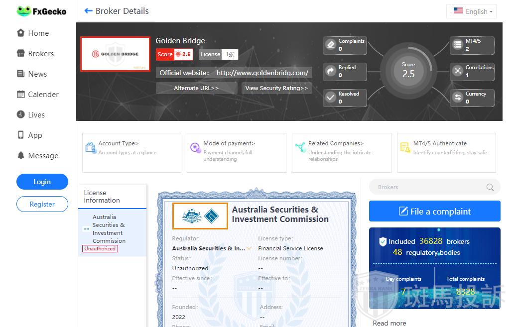 This broker is called Golden Bridge, which has been established for one year and ranks 4783 in the world. At present, there are 0 exchange license, and the risk scan shows 3 risks. Investors need to pay attention to relevant risks.